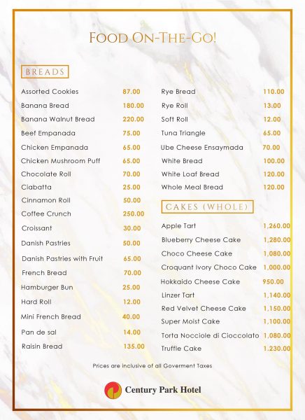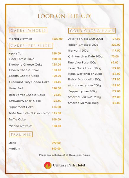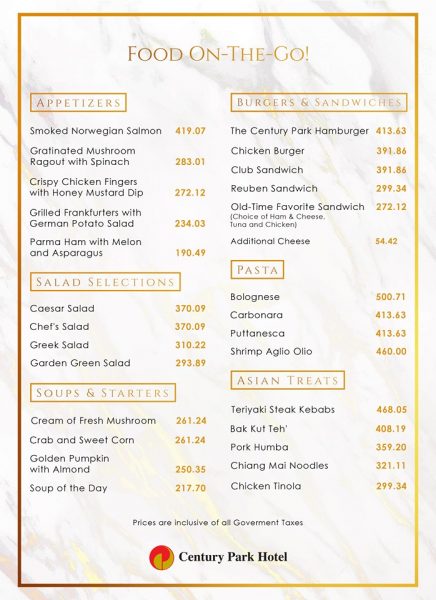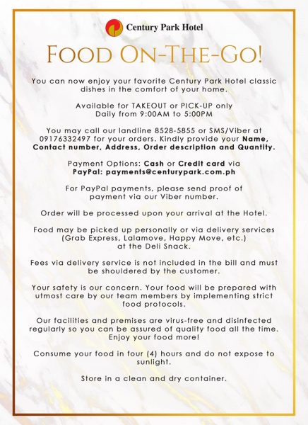 FOOD ON-THE-GO! Enjoy Century Park Hotel’s Gustatory Delights in the Comfort of Your Home.