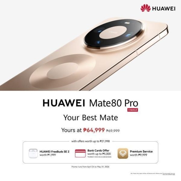 Secure yours today and receive an exclusive freebie bundle, which comes with a HUAWEI FreeBuds SE 2 (worth PHP 1,999) and a premium care service (worth PHP 9,999). Plus, enjoy an additional PHP 5,000 off when you pay using cards from select banks, available exclusively in stores. These exclusive offers are available from April 24 to May 31, 2026.
